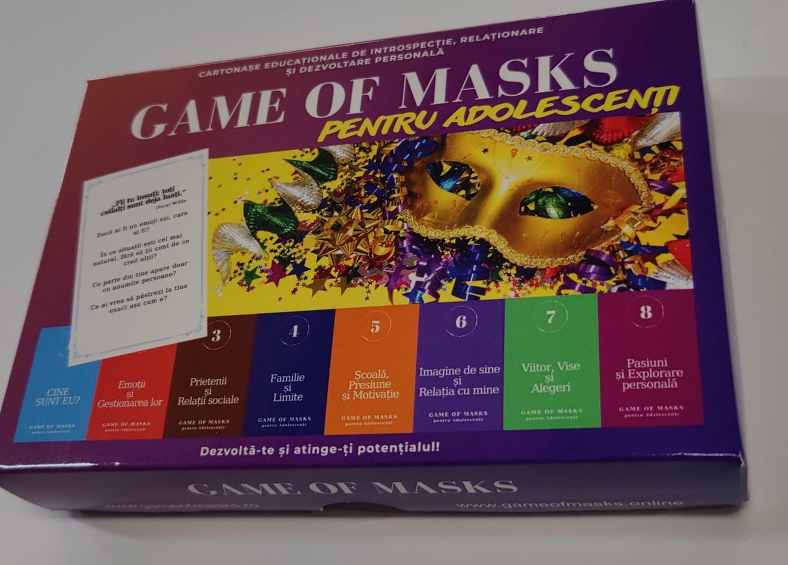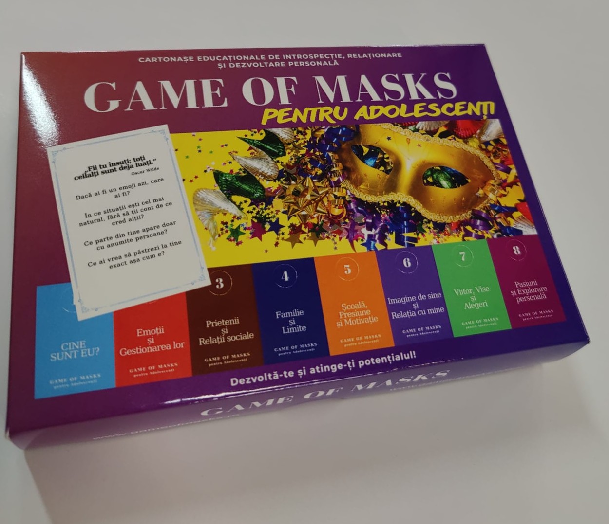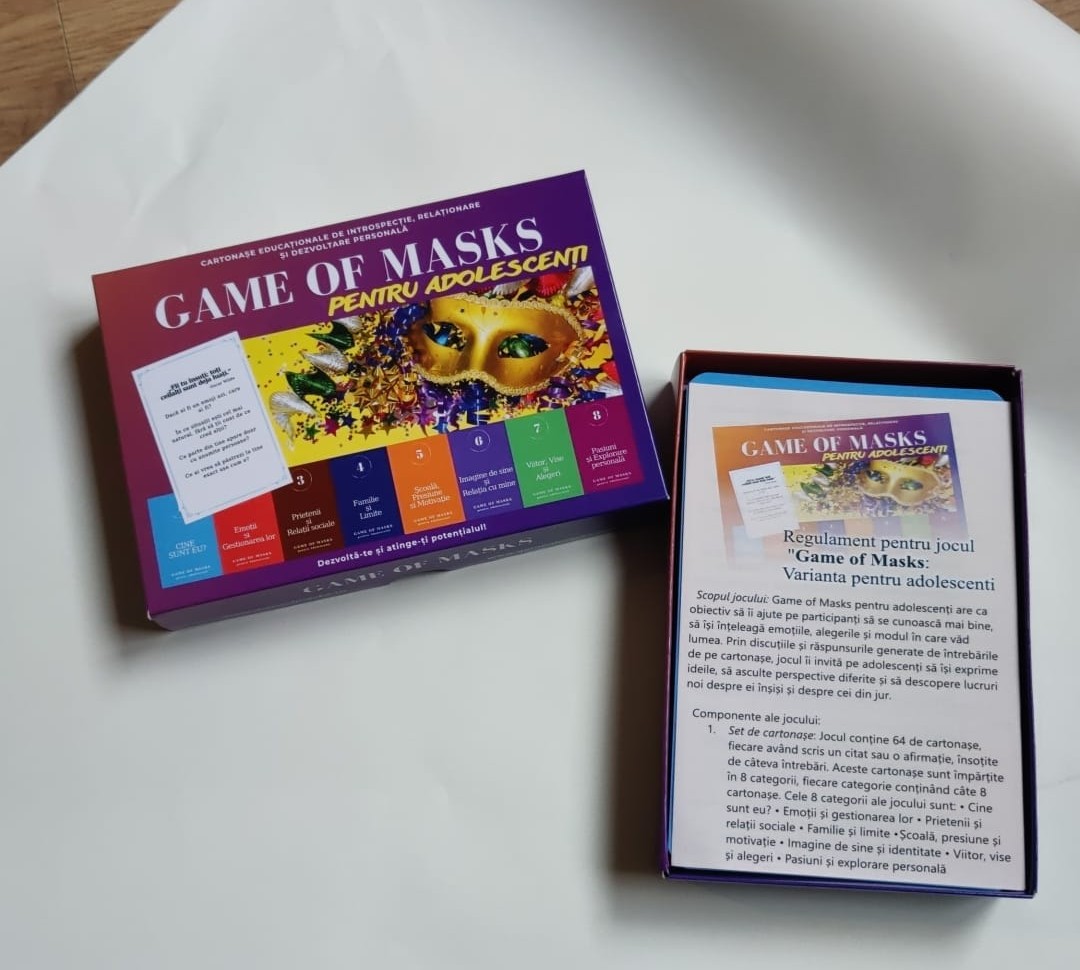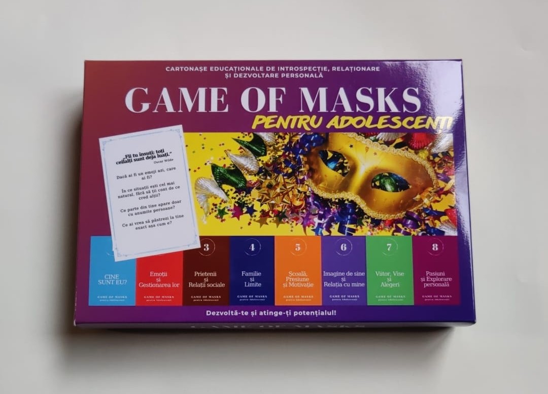 Game of Masks pentru Adolescenți este un set de 64 de cartonașe care ajută la deschiderea acestor conversații. Întrebările sunt gândite astfel încât să te pună pe gânduri și să te ajute să spui lucruri pe care, de multe ori, le ții doar pentru tine.