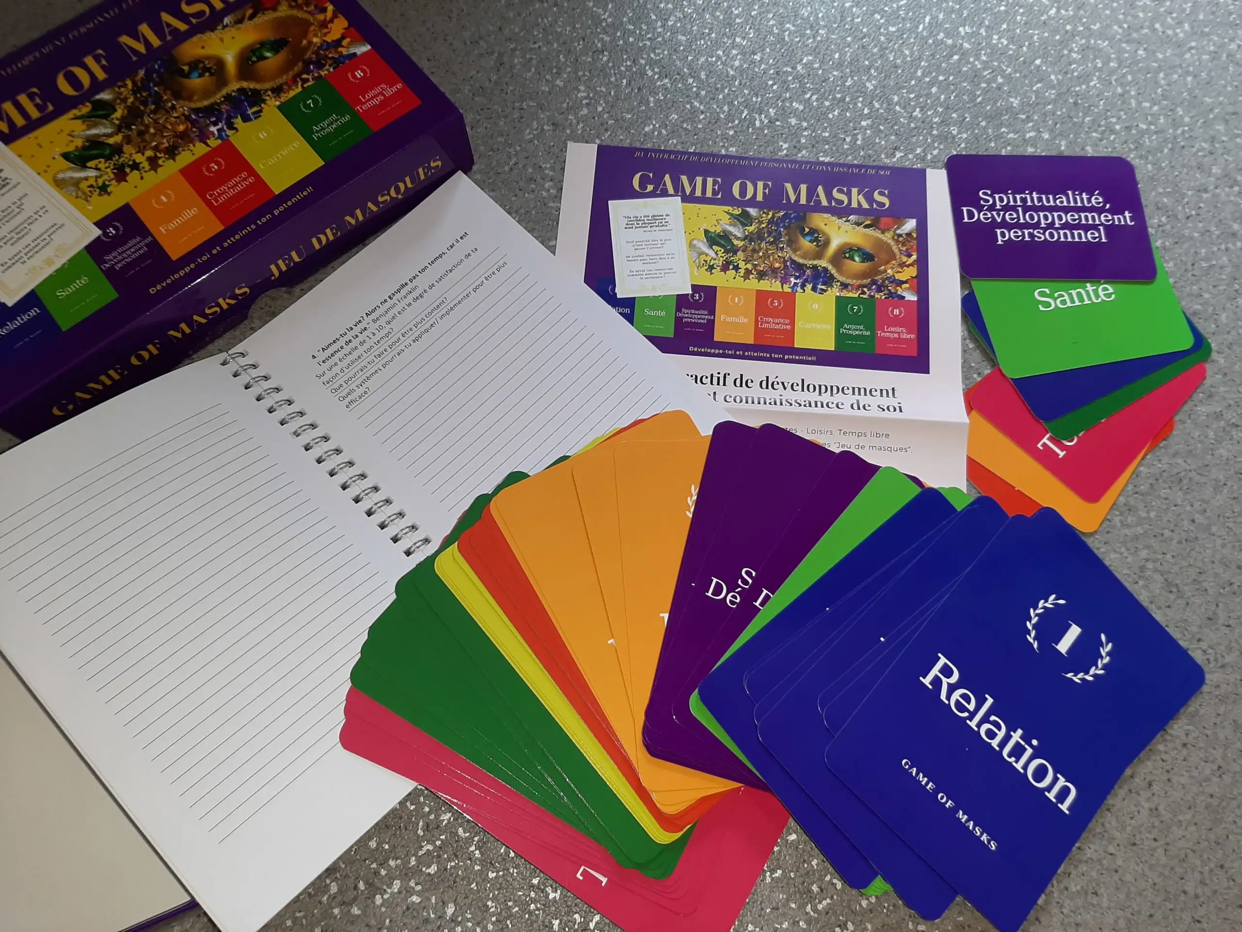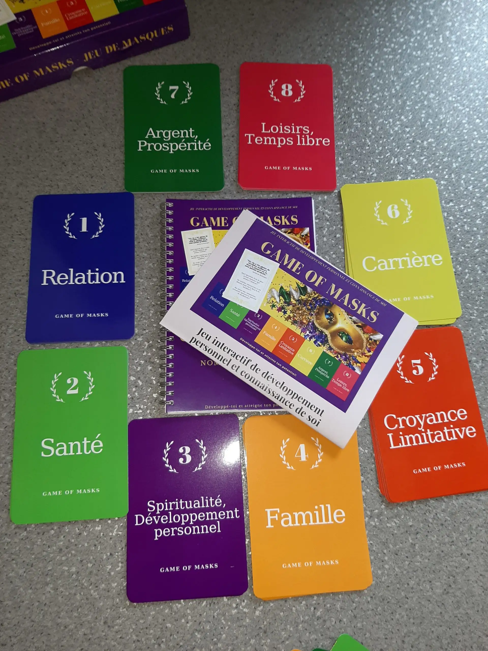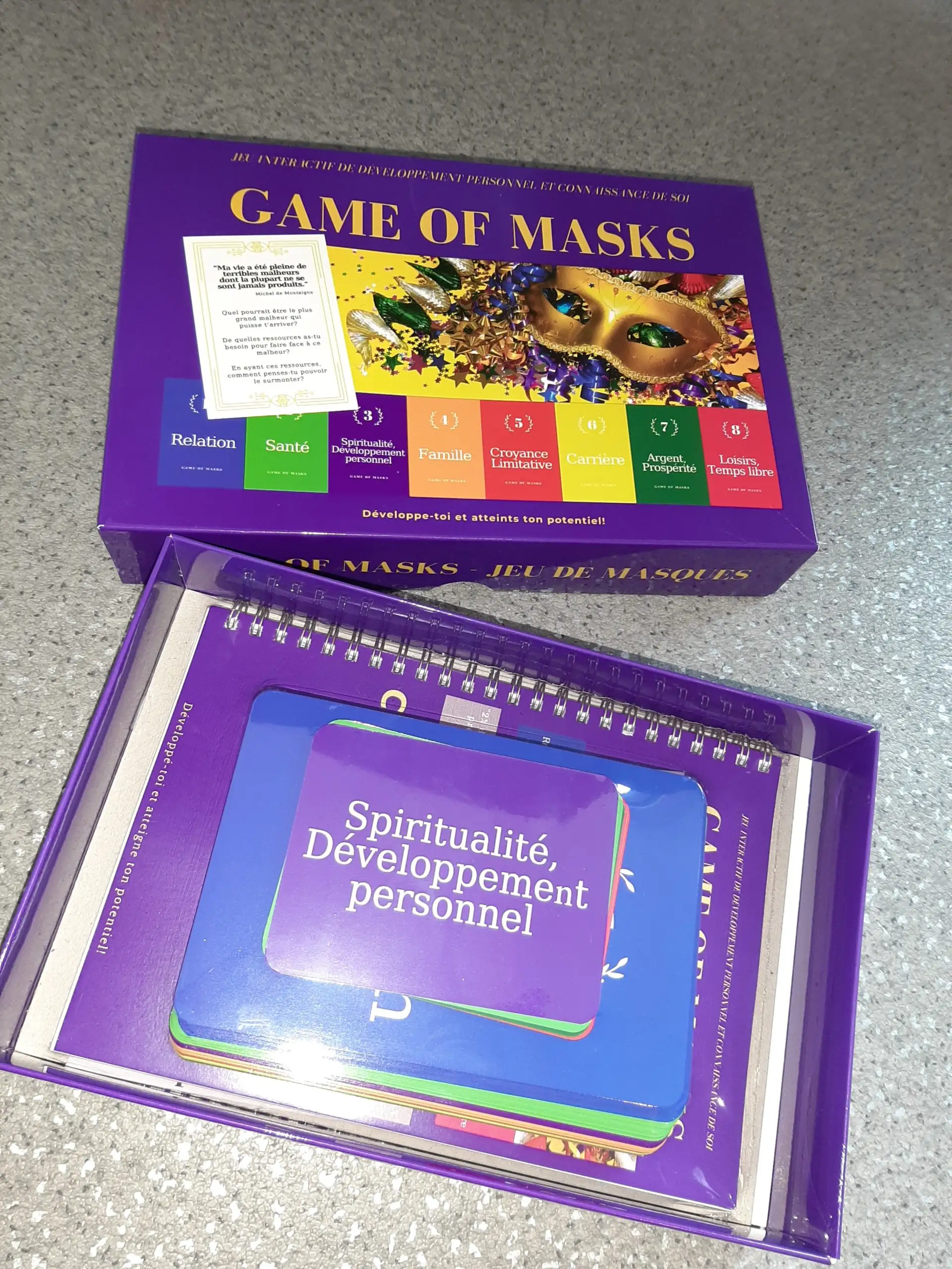 Game of Masks în franceză est un ensemble de cartes éducatives, soigneusement conçu pour la connaissance de soi, la construction de relations et le développement personnel. Avec 64 cartes et un cahier de travail inspirant, vous explorerez les huit domaines majeurs de votre vie : Relations, Santé, Spiritualité, Famille, Croyances Limitantes, Carrière, Argent et Loisirs.