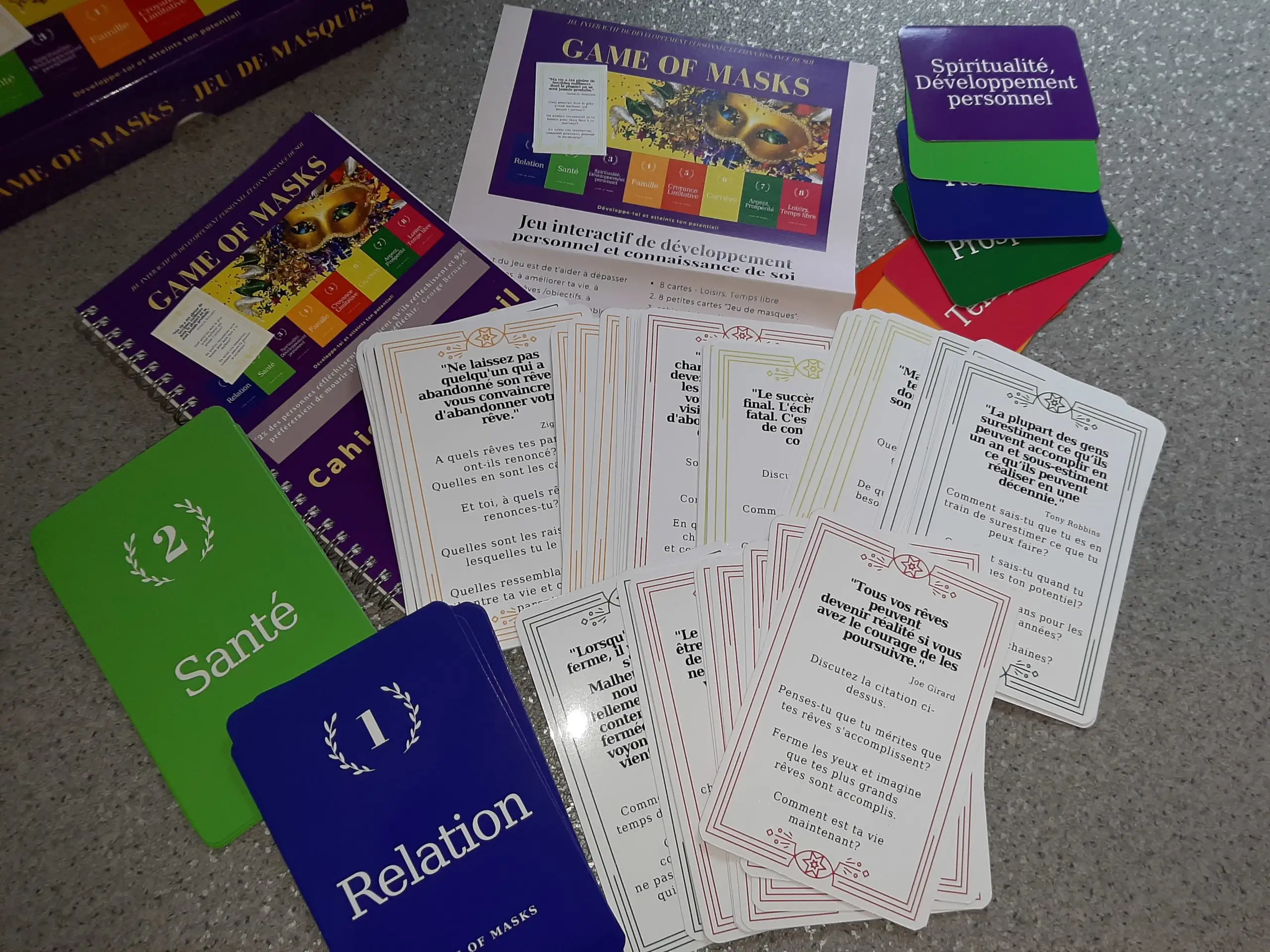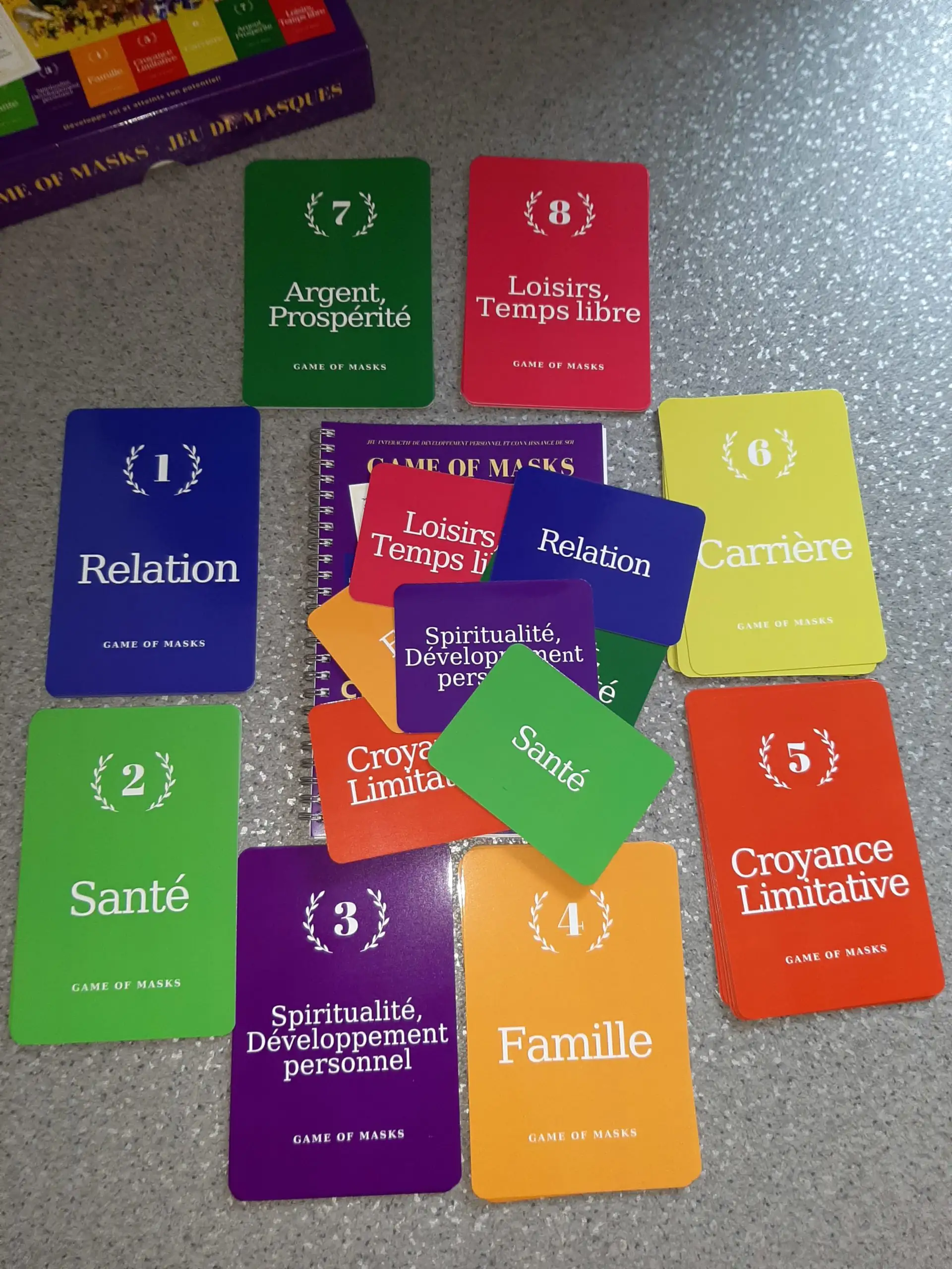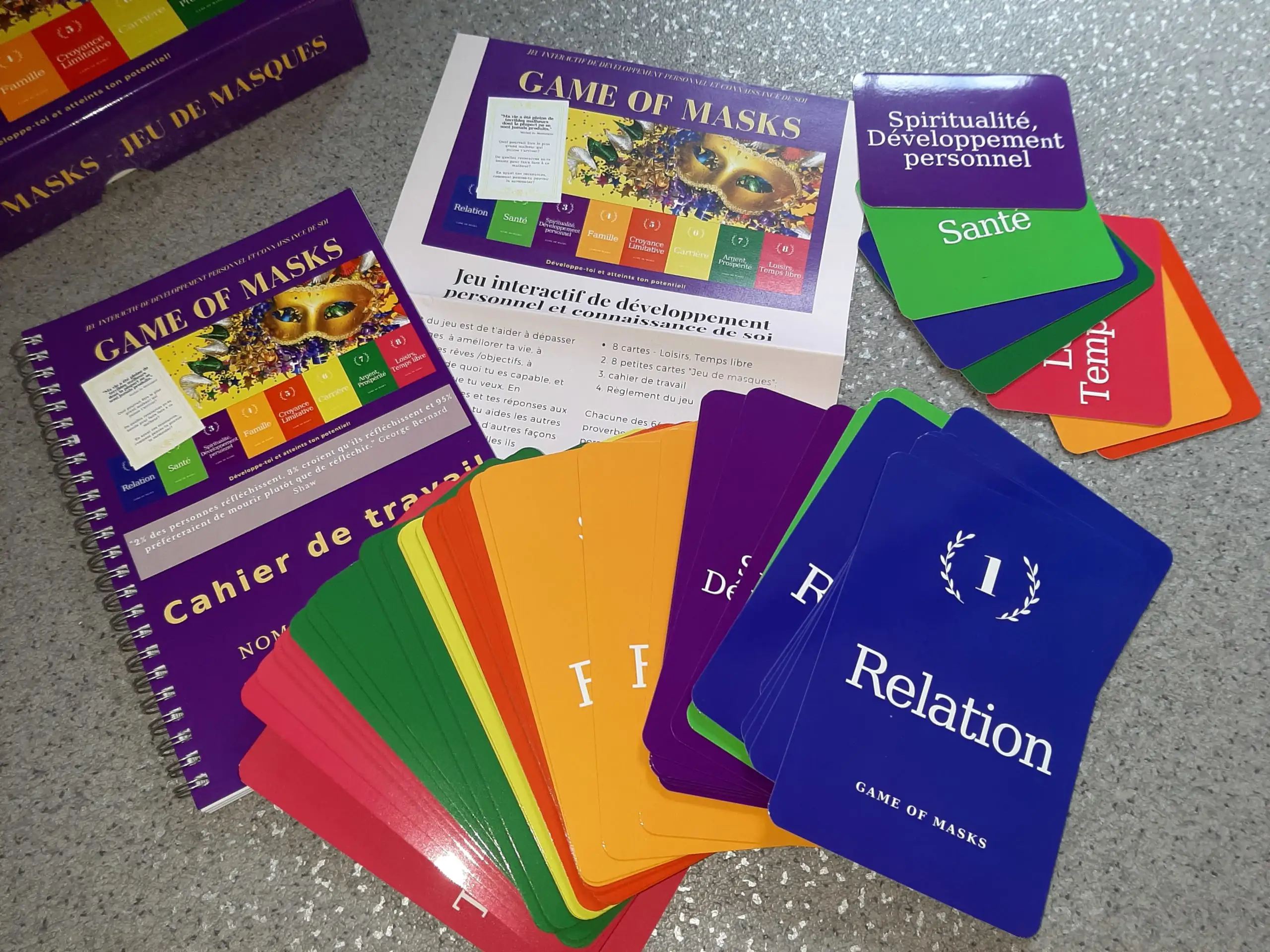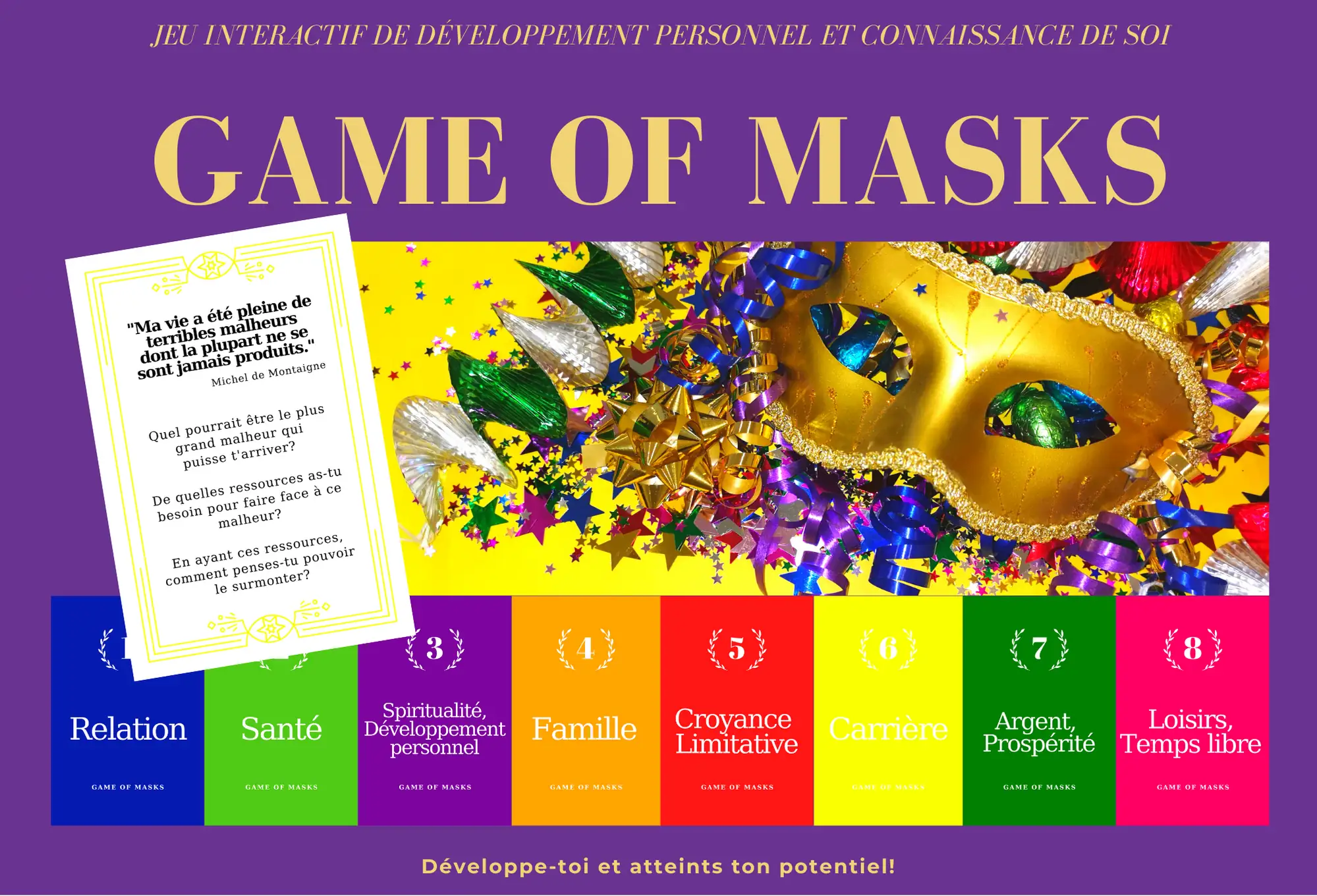 Game of Masks în franceză est un ensemble de cartes éducatives, soigneusement conçu pour la connaissance de soi, la construction de relations et le développement personnel. Avec 64 cartes et un cahier de travail inspirant, vous explorerez les huit domaines majeurs de votre vie : Relations, Santé, Spiritualité, Famille, Croyances Limitantes, Carrière, Argent et Loisirs.