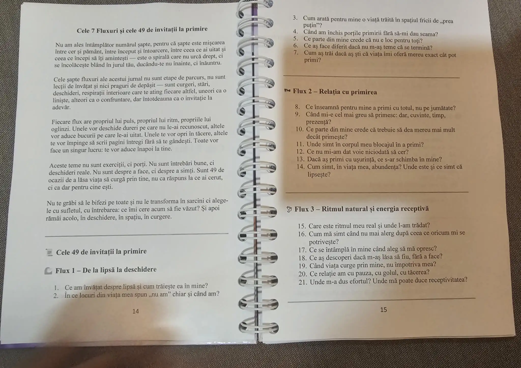 Acest jurnal este construit în jurul a 7 fluxuri — pași esențiali prin care viața curge în tine și prin tine: alegere, rezistență, control, abandon, curgere, dăruire, creație. Fiecare flux conține teme de introspecție care deschid uși uitate și te invită să îți regăsești propriul ritm, acel mod autentic de a trăi care nu se mai conformează, nu mai forțează, ci se aliniază.