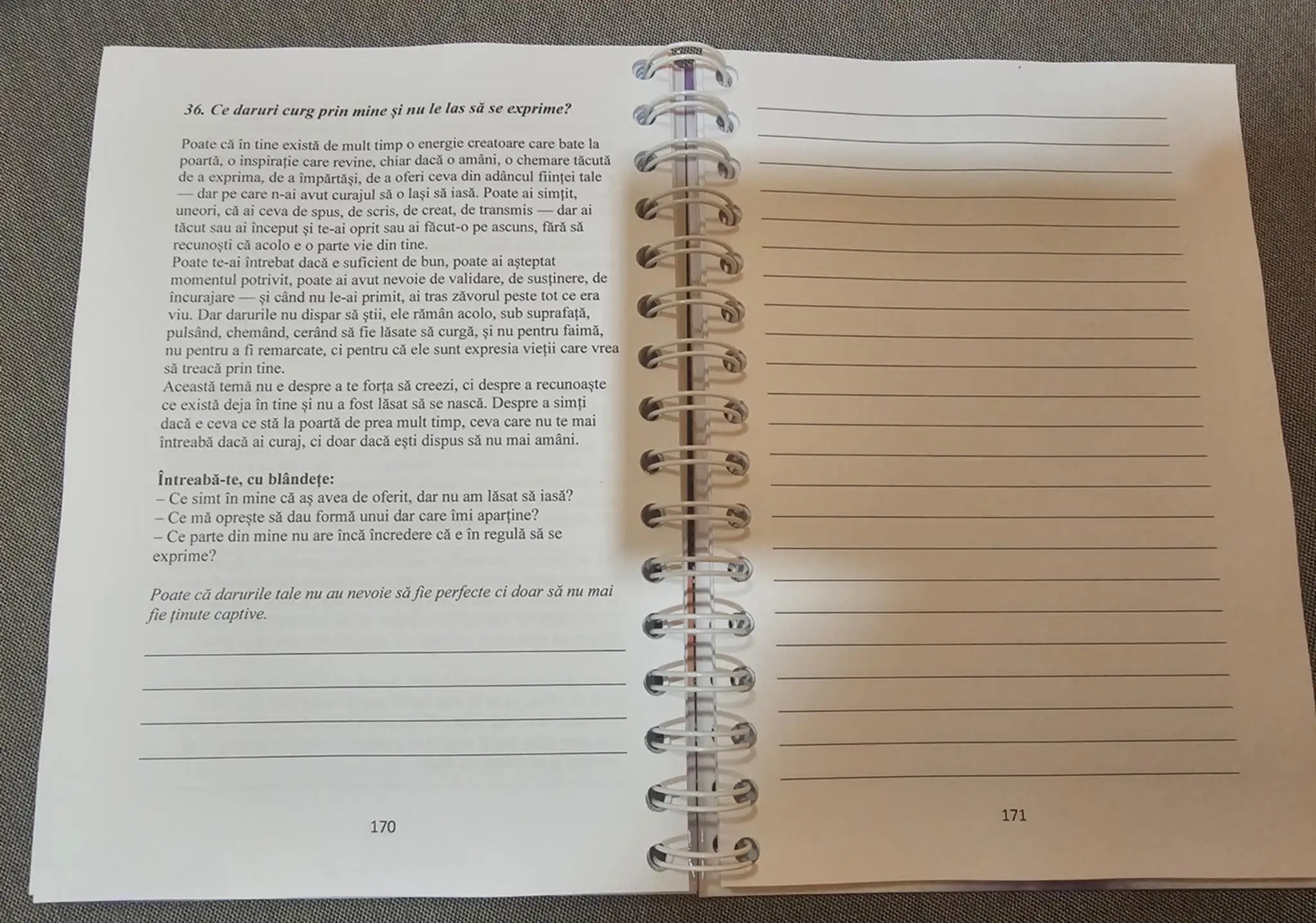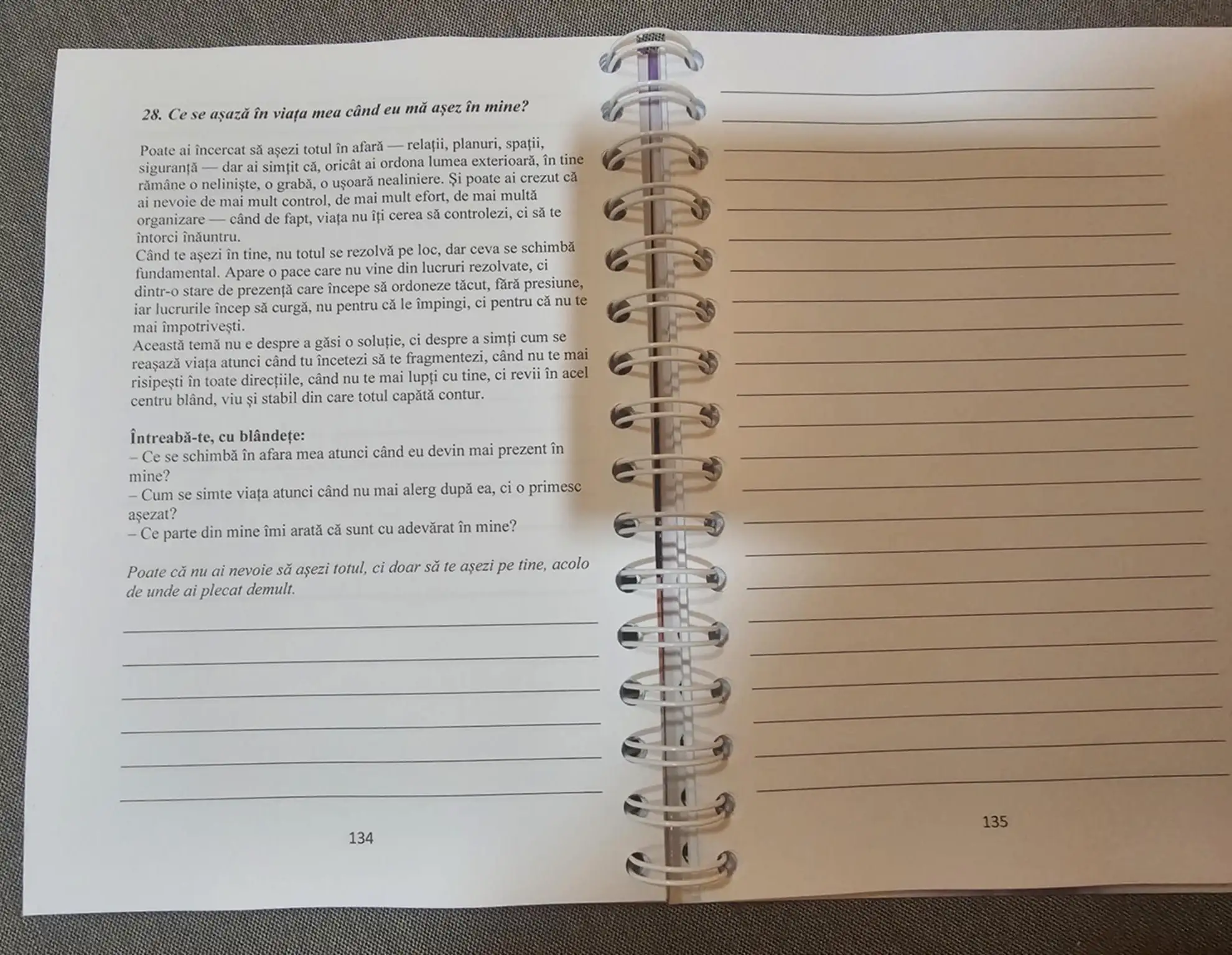 Scrisul devine aici un act de prezență și nu trebuie să scrii frumos, ci sincer, cu curaj, cu blândețe, cu mâinile tale și cu adevărul tău, așa cum e el. Fiecare temă e o invitație de a te opri, de a respira, de a simți din nou că ești aici. Nu pentru că ai toate răspunsurile, ci pentru că vrei să fii mai aproape de tine.
